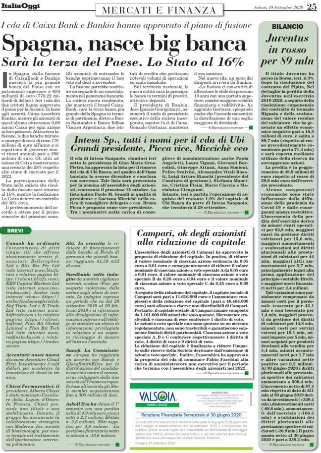 Avviso deposito relazione finanziaria annuale al 30 Giugno 2020 (Italia Oggi 19 Settembre 2020) |